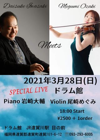 コロナ禍でまだまだライブ演奏が困難な中 今年初めての福岡県でのライブです。 【出演】 ピアノ:岩崎大輔 バイオリン:尾崎めぐみ 【ピアニスト岩崎大輔より】 久しぶりのドラム館での演奏 バイオリンとピアノ定番のデュオ編成 やるからにはお客様に喜んで頂ける選曲構成を画しています。 岩崎流バッハのフーガ・ト短調 それぞれの奏者のオリジナル曲 2月亡くなった音のマジシャン チックコリア氏の作品を敬意を込めて演奏させて頂きます。 駅からの近さ 日本一かも知れない ライブハウス ドラム館 ぜひお運び下さいませ。 |